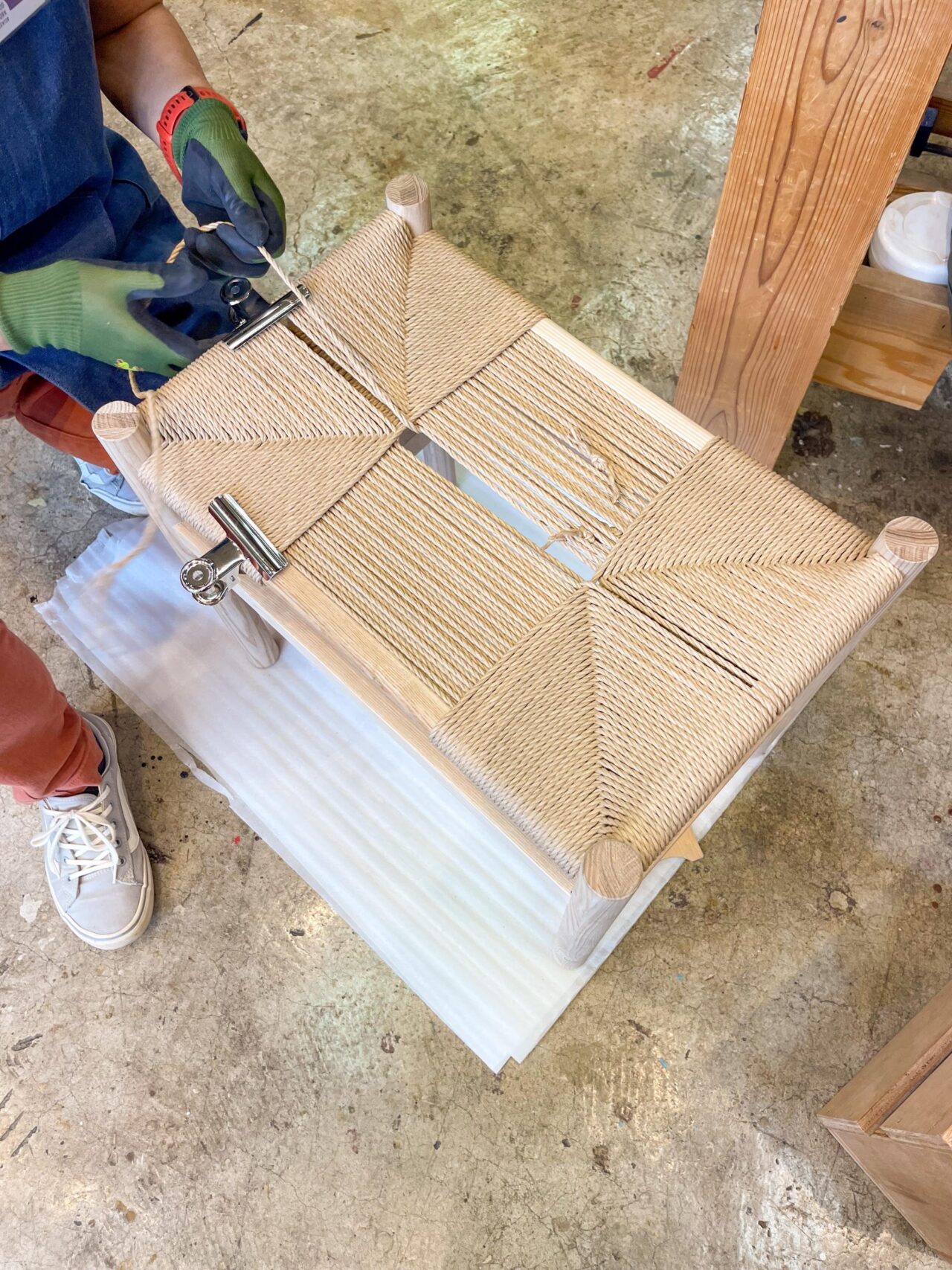 ペーパーコードを使い、スツールの座面を「封筒編み」で仕上げます。