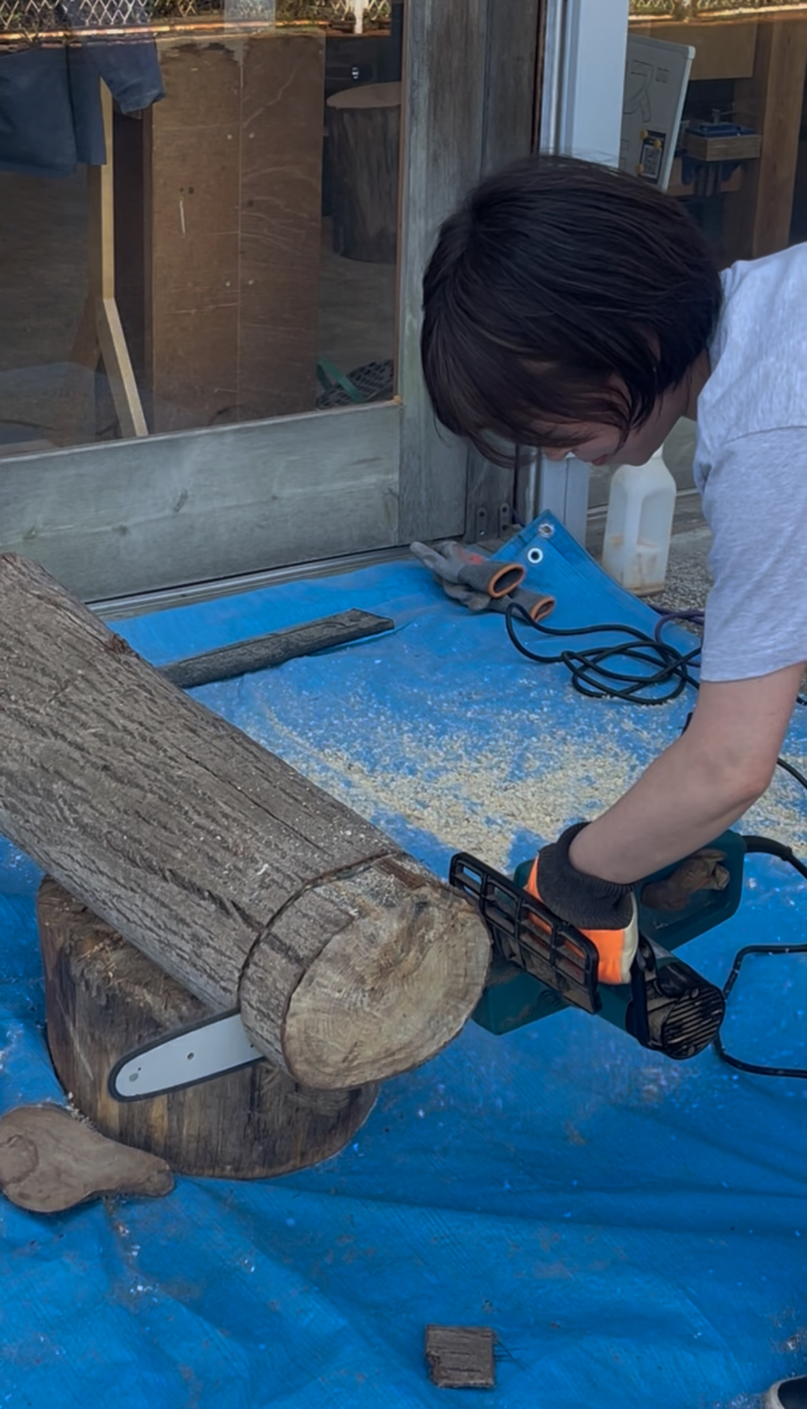 グリーンウッドワークに使用する材料の木取りに必要なチェーンソーの構造や安全な使用方法を学びます。